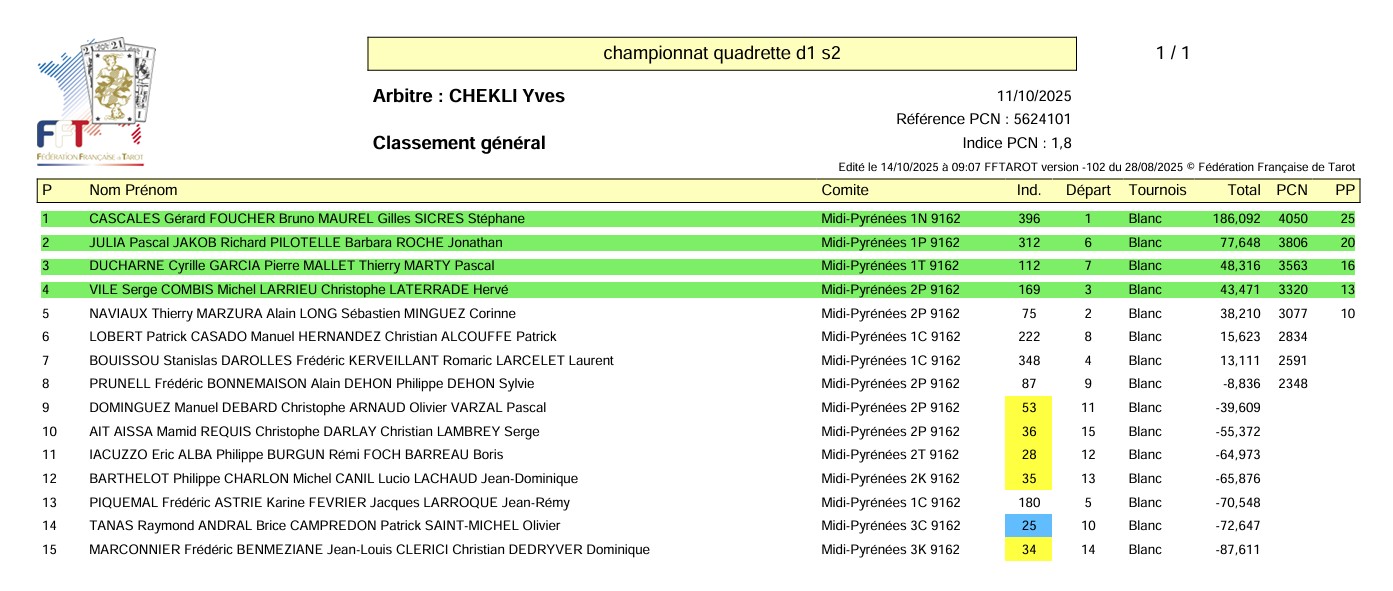 Résultats championnat quadrette 1ère division saison 2025-2026